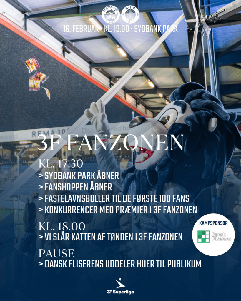 Der er kampstart 19.00, men du kan komme på stadion allerede fra 17.30, hvor der her vil være adgang til 3F Fanzonen, som er placeret bag stemningstribunen.