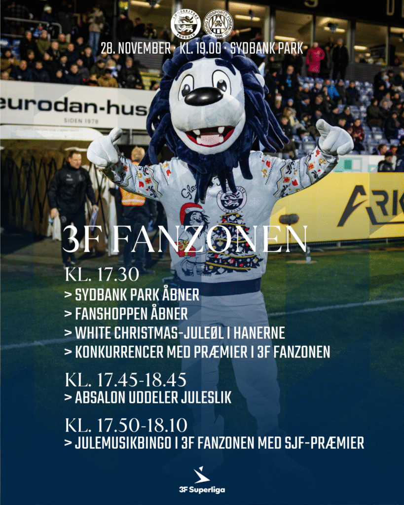 Fra klokken 17.50 er der julemusikbingo i 3F Fanzonen, hvor der er fine præmier fra Sønderjyske Fodbold på højkant. Det er naturligvis gratis at deltage.