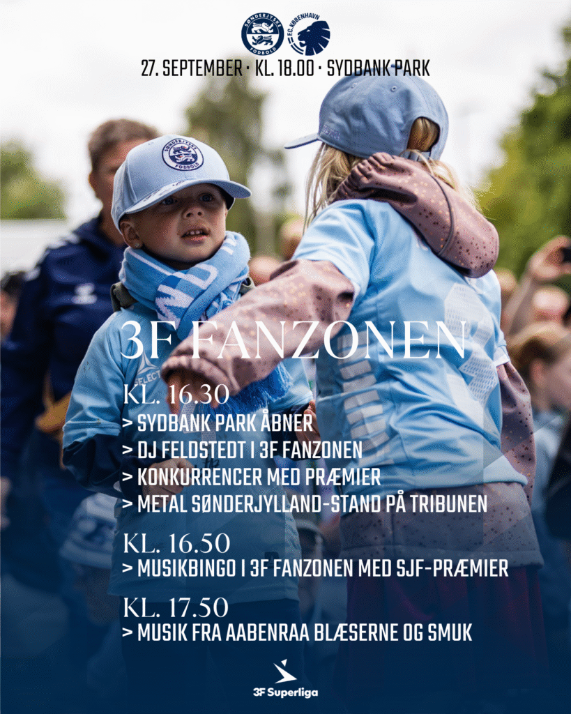 Fra klokken 16.50 er der musikbingo i 3F Fanzonen, hvor du kan vinde præmier fra Sønderjyske Fodbold – det er gratis at deltage.